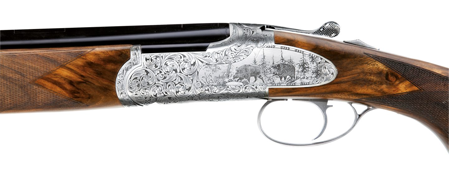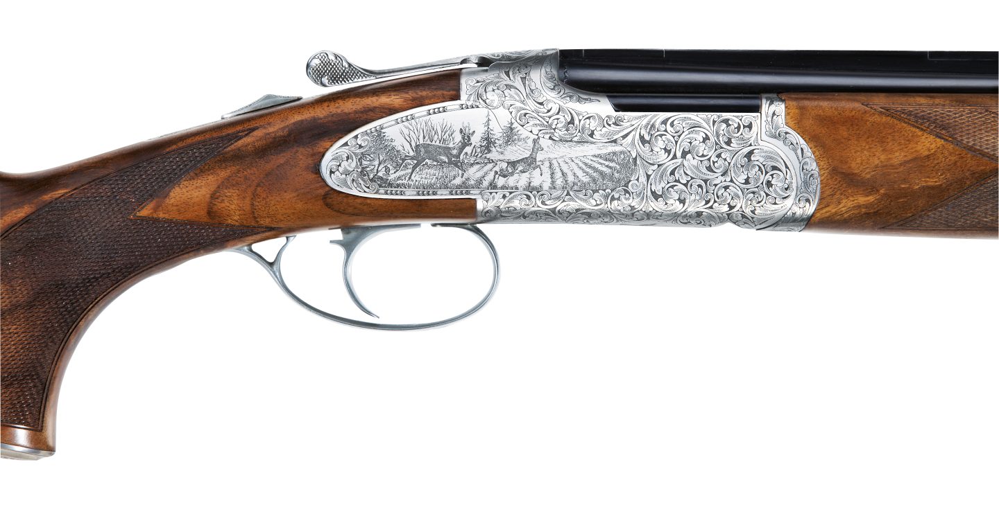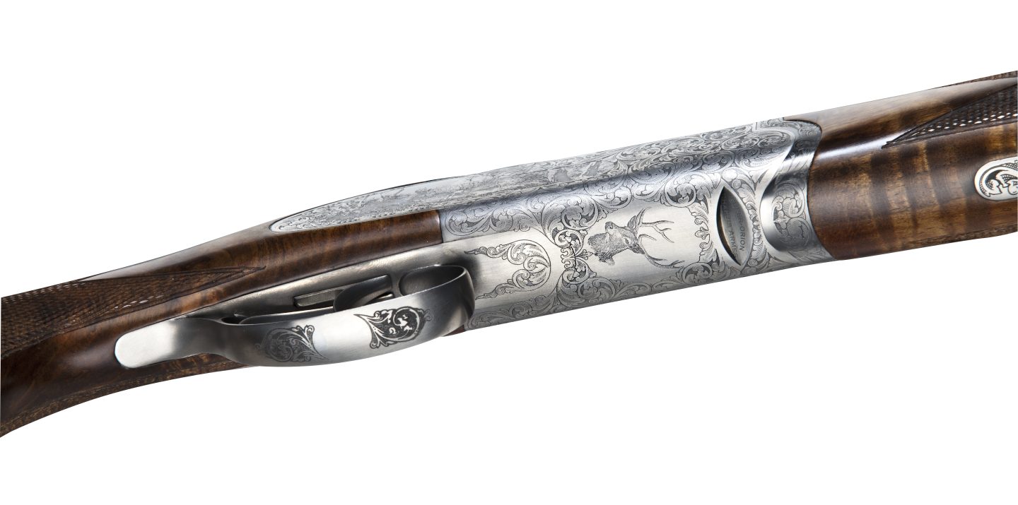 New action, originally developed for 28 ga., with reduced height and width for faster handling. Rounded out design, with a smaller detonating and reduced firing pins spacing. New “Royal” style deep-cut engraving wrapping around the receiver, with new game scenes engraved on both sides and bottom of the action.